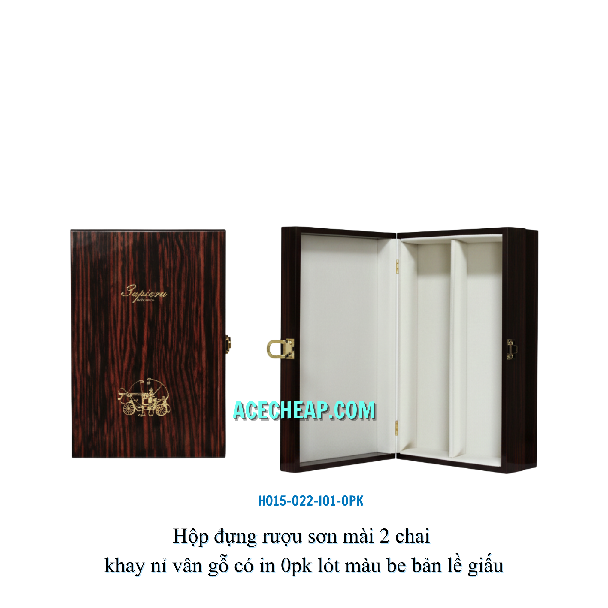 - Hộp đựng rượu sơn mài 2 chai khay nỉ vân gỗ có in 0pk lót màu be bản lề giấu HO15-022-I01-0PK
