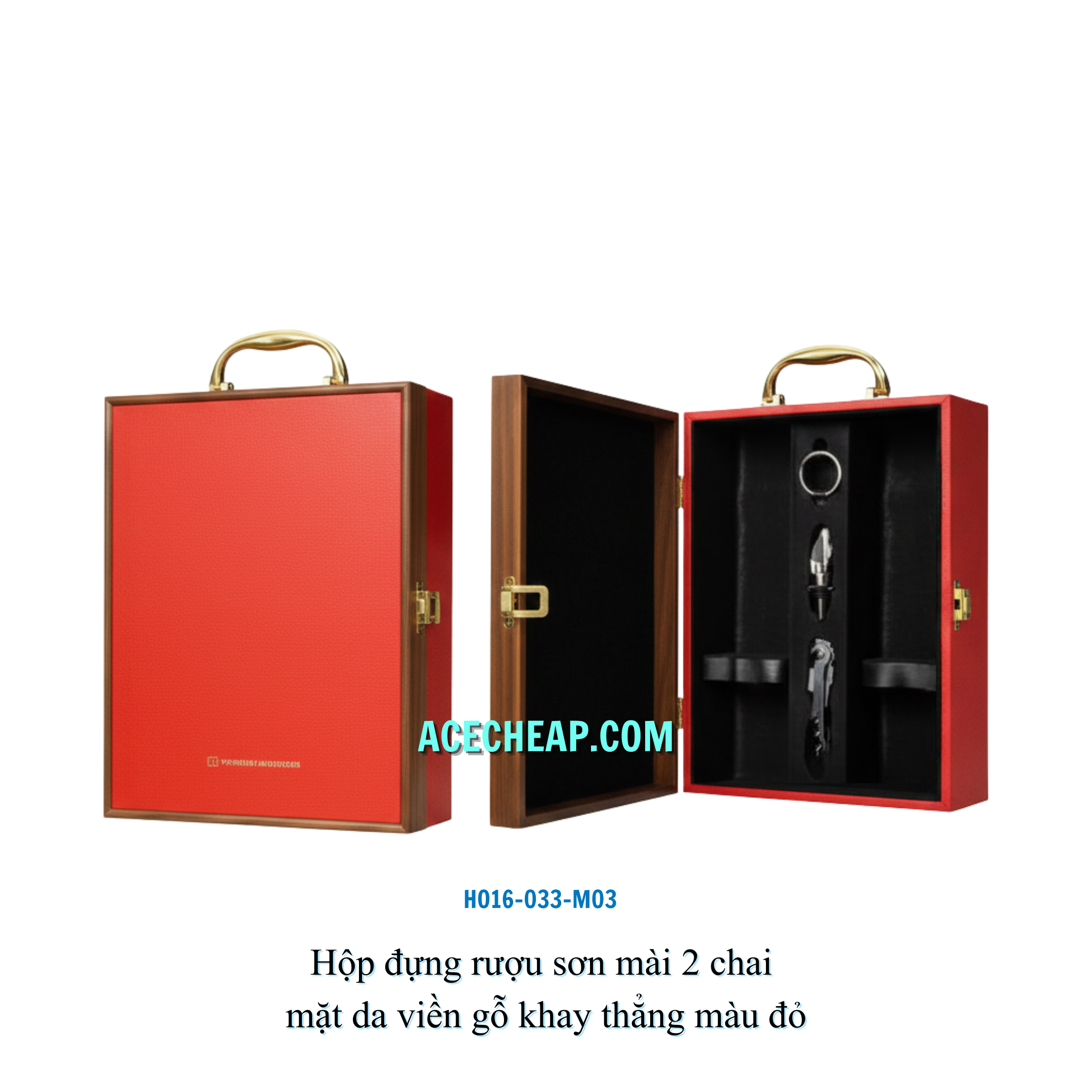 Hộp đựng rượu sơn mài 2 chai mặt da viền gỗ khay thẳng màu đỏ HO16-033-M03
