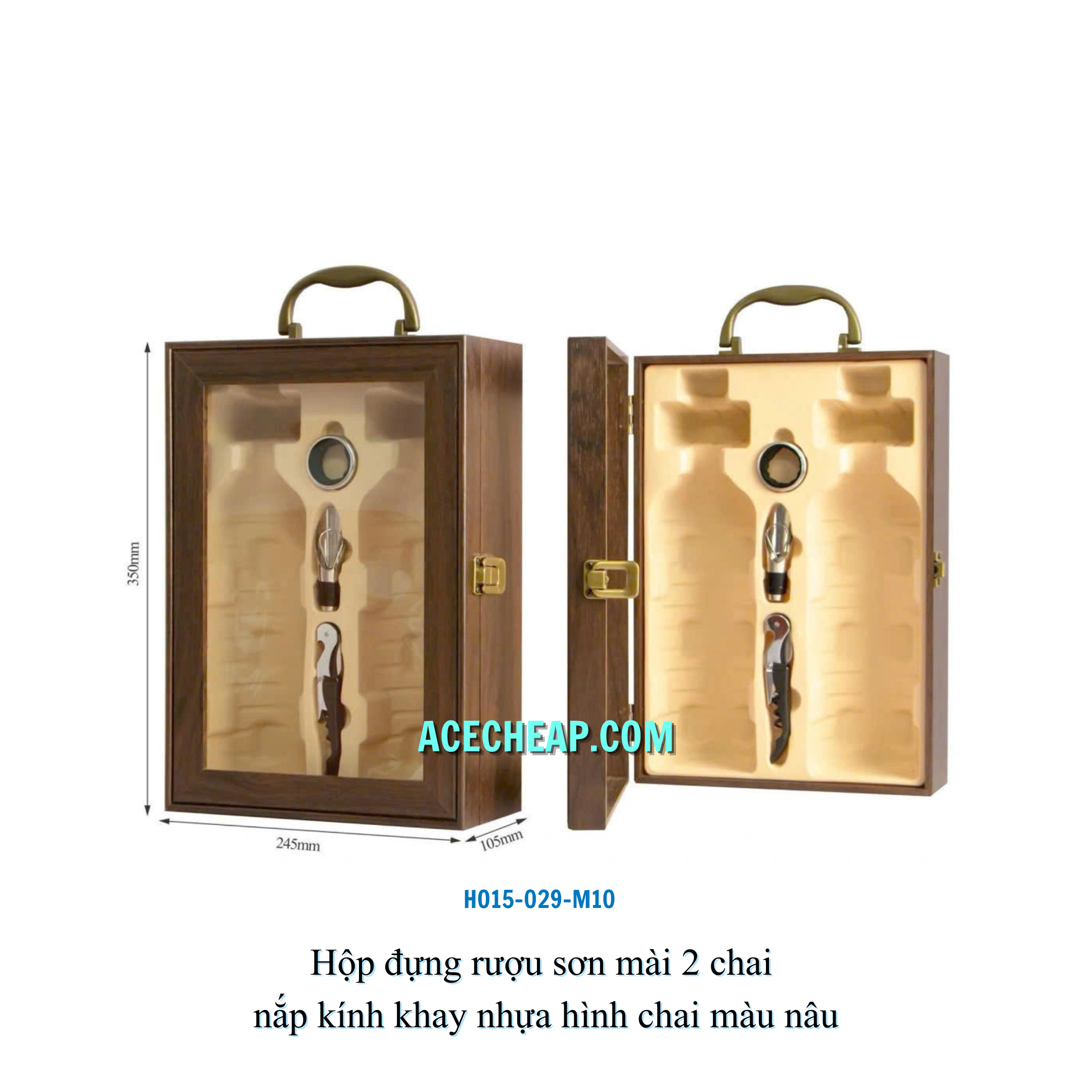 Hộp đựng rượu sơn mài 2 chai nắp kính khay nhựa hình chai màu nâu HO15-029-M10