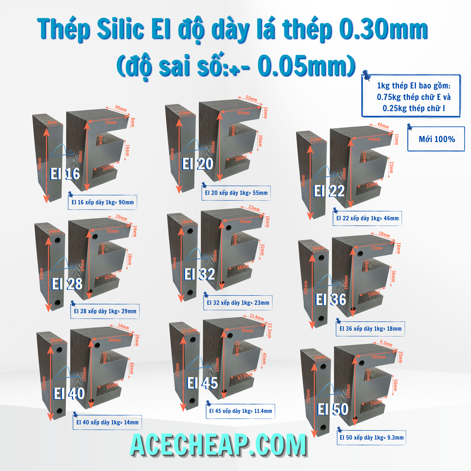 - Có cung cấp sẵn khuôn nhựa và gông sắt kèm theo nếu cần Tỷ lệ EI/ 1 bộ: 3E và 1I ( Ví dụ: EI 1 kg thì bao gồm: 0.25 kg I+ 0.75 kg E)